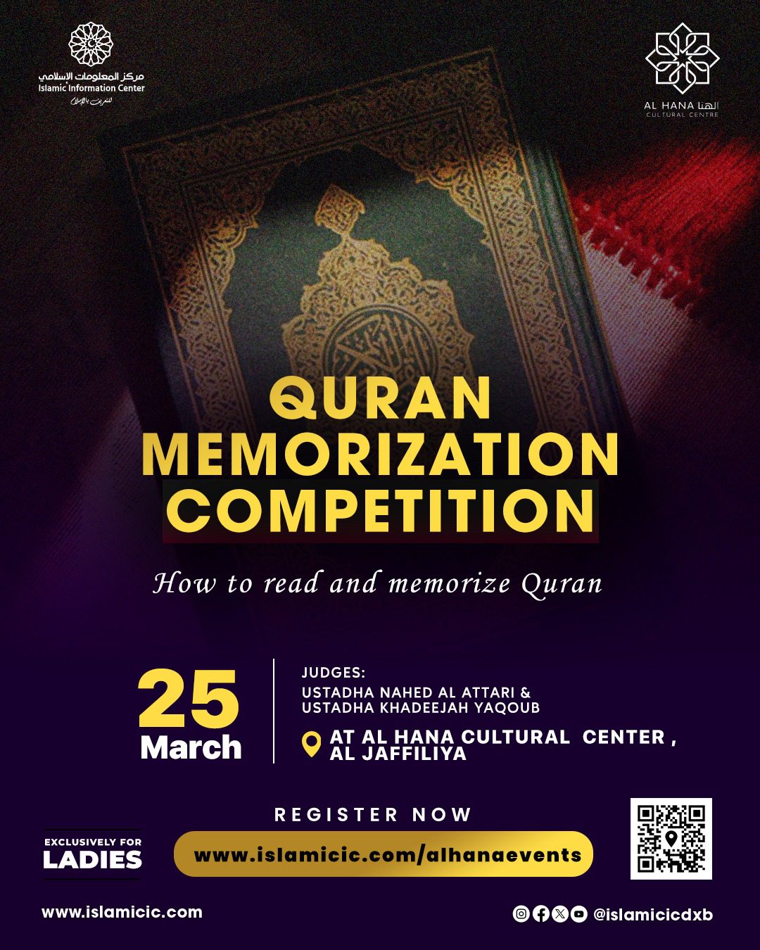 Join the Quran Memorization Competition at Al Hana Center, exclusively for women. Enhance your skills in reading and memorizing the Quran. Register now and embark on this inspiring journey!