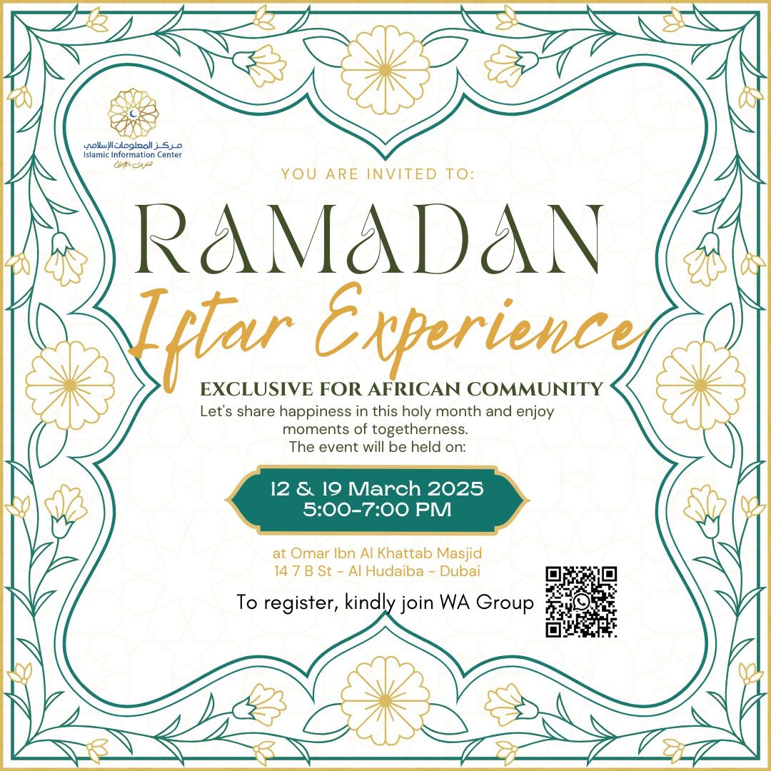 Join us for a special Ramadan Iftar Experience, exclusively for the African community. Come together to share happiness, strengthen bonds, and embrace the spirit of Ramadan. Register now to be part of this beautiful gathering!