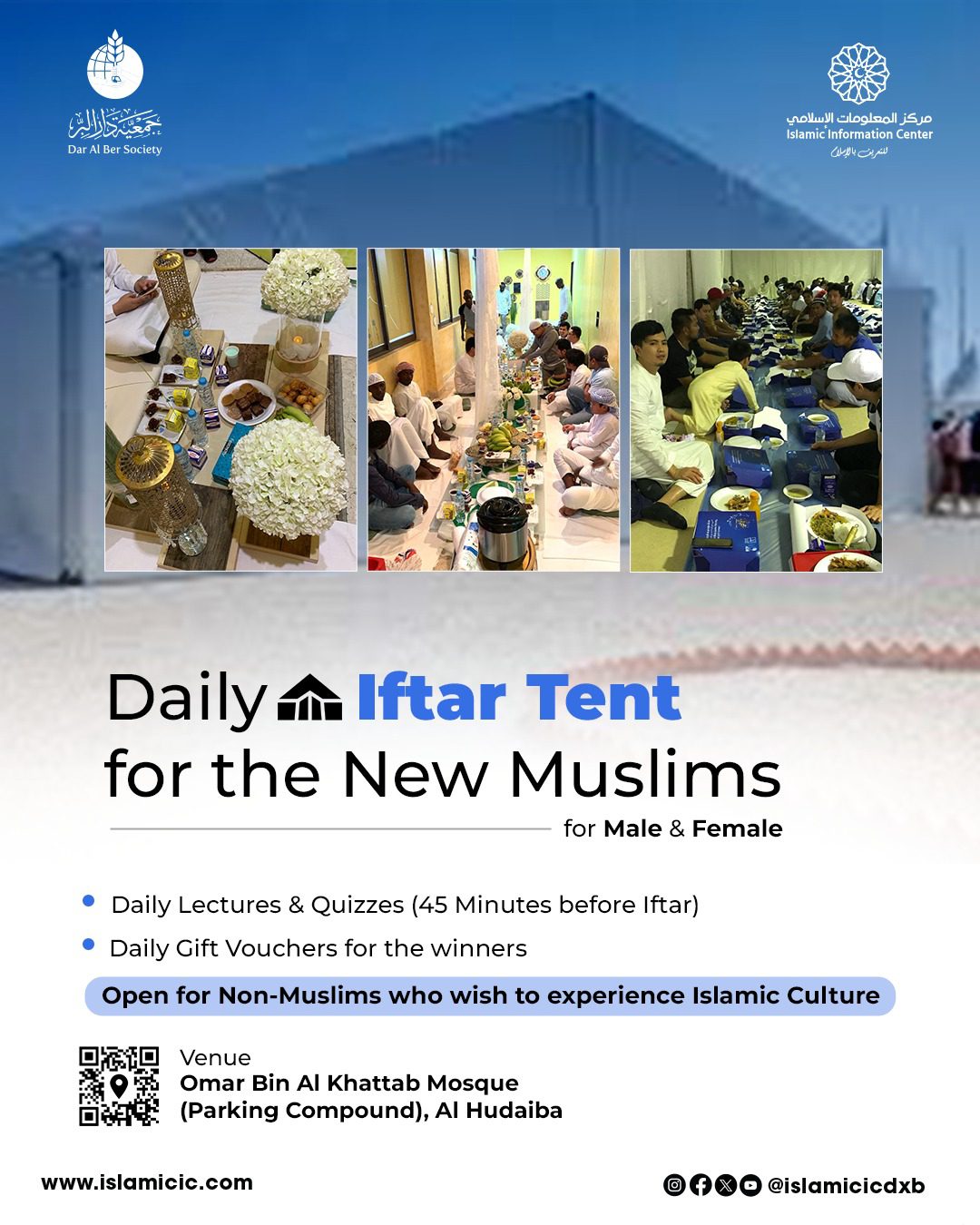 Join our Daily Iftar Tent for New Muslims and experience a welcoming Ramadan atmosphere. Engage in interactive lectures and quizzes before Iftar, with daily gift vouchers for winners! Open to Non-Muslims curious about Islamic culture.